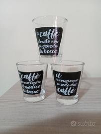 Vendo un grazioso Tris di Bicchierini da caffè in vetro con frasi scritte su un fondo "lavagna".