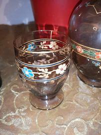 Bottiglia con tappo e 2 bicchieri in vetro fume' marrone con decorazioni dipinte in rilievo colorate e oro con fiorellini e ghirigori tipici del liberty o che dir si voglia art nuveau misura altezza totale bottiglia cm 28 bicchieri altezza cm 9,5 apertura diametro 6,5 possibile spedizione (cas)