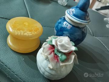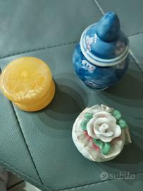Set di tre graziosi cofanetti decorativi, perfetti per aggiungere un tocco di stile. - Cofanetto giallo con decorazioni floreali larghezza 5 cm - Cofanetto blu con coperchio a punta.9,5 cm altezza - Cofanetto bianco con decorazione floreale in rilievo larghezza 5 cm