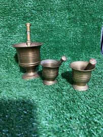 Splendido set coordinato composto da tre mortai d'epoca in ottone massiccio, ognuno accompagnato dal proprio pestello originale. Questo lotto è perfetto per chi cerca un elemento d'arredo di impatto per la cucina, un'erboristeria o per arricchire una collezione di oggettistica farmaceutica d'altri tempi.