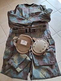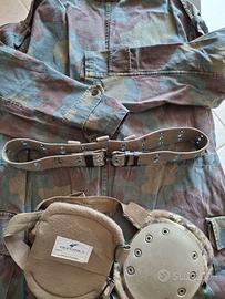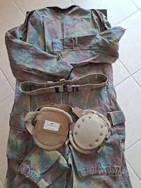 Tuta mimetica integrale da lavoro. Abbottonatura frontale nascosta. Taglia XL idonea per chi è alto circa 180 cm e pesa circa 85 kg. Indossabilità comoda (permette tutti i movimenti e di inginocchiarsi con facilità). Versatile e resistente, in tessuto militare indistruttibile. Utili tasconi laterali sulle cosce, oltre alle tasche sul petto. Cinturone militare regolabile a corredo ed anche due utilissime ginocchiere professionali Defcon5. Tutti i capi sono usati ma in ottimo stato e, considerata la loro resistenza ed indistruttibilità, hanno ancora lunga vita. Uso: lavoro professionale, hobbistica, fai da te, giardinaggio, caccia, pesca, nautica, escursionismo, altro.