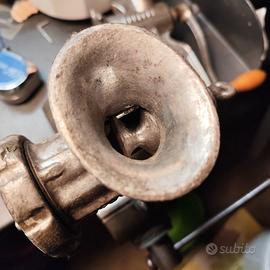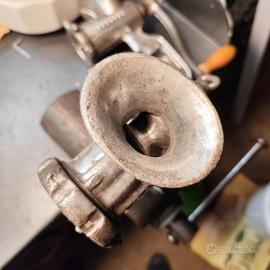 Tritacarne manuale d’epoca marchiato STANDARD WERK, prodotto in Austria, modello 55 Realizzato in metallo (ghisa/ferro) con manovella originale e impugnatura in legno, è un oggetto robusto e autentico, ideale sia per utilizzo che come pezzo da collezione o arredo in stile rustico. Caratteristiche: Funzionamento manuale con manovella Sistema di fissaggio a morsetto per tavolo Struttura solida e pesante Marchio ben visibile sul corpo Condizioni: Buone condizioni generali per l’età Presente normale patina del tempo (vedi foto) Meccanismo da verificare/lubrificare prima dell’uso Perfetto per: collezionisti di utensili d’epoca arredamento cucina rustica/industriale appassionati di oggetti vintage funzionanti Dimensioni: circa 20x20x10cm