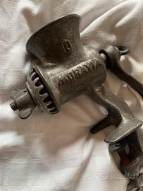 Manovella con impugnatura della stessa in legno, morsetto di fissaggio il numero 0 indica la macinatura più fine della carne