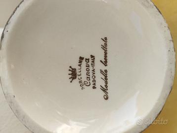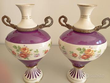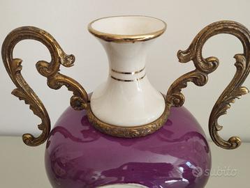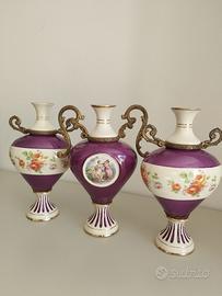 trittico anfore vintage porcellane Canova Padova in buone condizioni colore viola , quella principale con medaglione centrale dipinto a mano raffigurante due donne con bambino e le due laterali con motivi floreali , manici in bronzo finemente lavorati. altezza 26 cm larghezza 11 cm.