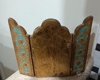 Bellissimo Trittico in legno dorato con raffigurazione della Madonna con Gesù e un'altra figura. L'opera presenta decorazioni floreali e motivi geometrici. - Cornice in legno dorato. - Dipinto centrale a forma ovale. - Pannelli laterali decorati. Oggetto del Secolo scorso, ottimamente conservato (normali piccoli segni del tempo possono essere presenti), di una raffinatezza unica e valore storico importante. Da collezione!