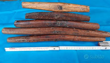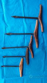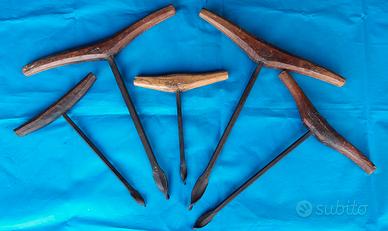 Vendo trivelle grandi antiche in ferro battuto dei primi del '900, marchiate con le stellette. - Grande lunga manico legno 43,5 cm, spesso 3 cm x 3 cm, al centro 5 cm, ferro lungo dal manico alla punta 45 cm, quadrato in ferro largo 2 cm x 2 cm, punta larga 3 cm; - 2^ Grande lunga manico legno 42 cm, spesso 3 cm x 3 cm, al centro 6 cm, ferro lungo dal manico alla punta 47 cm, quadrato in ferro largo 1,5 cm x 1,5 cm, punta larga 3 cm; - Più piccola lunga manico legno 33 cm, spesso 3 cm x 3 cm, al centro 5 cm, ferro lungo dal manico alla punta 42 cm, quadrato in ferro largo 1 cm x 1 cm, punta larga 2 cm; - Piccola lunga manico legno 24 cm, spesso 3 cm x 3 cm, al centro 3 cm, ferro lungo dal manico alla punta 35 cm, quadrato in ferro largo 1 cm x 1 cm, punta larga 2 cm; - Più piccola lunga manico legno 24,5 cm, spesso 2,5 cm x 2,5 cm, al centro 4 cm, ferro lungo dal manico alla punta 28 cm, quadrato in ferro largo 1 cm x 1 cm, punta larga 1,5 cm. Peso totale 3 kg. Prezzo 70 euro in blocco. Spedizioni in tutta Italia e in tutto il mondo!!! Spedizioni in tutta Italia, per ogni info e dettagli contatto solo via Whatsapp o telefono al 349-0869294.