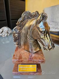 trofeo o premio commemorativo raffigurante una testa di cavallo, probabilmente realizzato in lega metallica con base in marmo rosso/arabescato.
