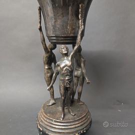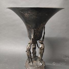 Trofeo coppa in metallo e legno, formata da 3 figure virili che sostengono una coppa, al centro fascio littorio, basamento in legno (tarlato)