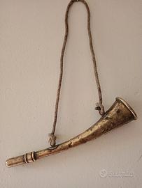 Una trombetta in ottone in buone condizioni generali, con cordicina originale. Usata per il richiamo nel bosco da mio nonno. Misura cm 25 e diametro 6 cm, non produce suoni, da esposizione e collezione. Potrebbe anche risultare un accessorio per auto epoca o altro.