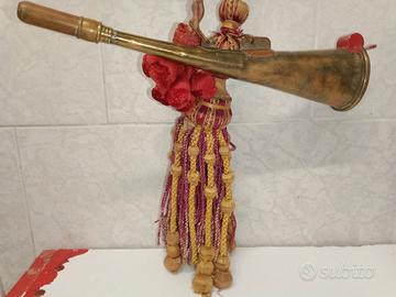antica trombetta con fischietto probabilmente usata dal cantoniere o dal ferroviere.... marchio stampato in evidenza.. con pendagli dorati.... fischietto posato sul davanti.... pezzo unico e rarissimo... .