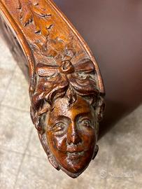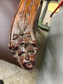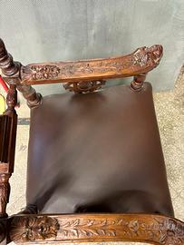 Trono poltrona intagliata a mano fine 800 con seduta in pelle nuova e decarazioni intagliati direttamente sul massello.