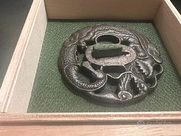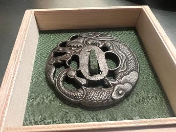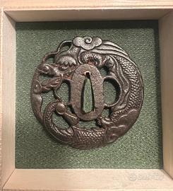 TSUBA Drago Traforato scuola Kinai. Guardia di Spada Giapponese Edo Antica Questo pezzo presenta una grande base in ferro ben forgiata e decorata con un potente disegno di drago. ■Dimensioni (circa) - Lunghezza: 7,5 cm - Larghezza: 7,5 cm - Spessore: 0,5 cm - Peso: 122 g - Scatola Tsuba inclusa.