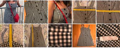 Tubino donna con bretelle, tessuto fantasia vichy nero e bianco , poliestere, viscosa ed elastan. Abbottonatura sul davanti con 9 grandi bottoni neri tutta lunghezza. Vedi indosso in foto. Taglia M, misure nel dettaglio in foto.