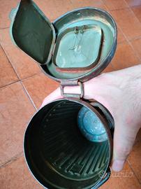 il tubo è vissuto, in buone condizioni, senza buchi o ammaccature evidenti. La vernice in alcuni punti tende a scagliarsi, e la ruggine, ormai stabile, non ha pregiudicato l'integrità della lamiera, per cui coperchio e gancio a molla, chiudono bene.