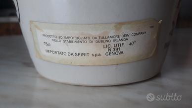 bottiglia vintage di Tullamore Dew blended Irish whiskey, imbottigliato nello stabilimento di Dublino (Irlanda) in Bottiglia in ceramica (con libretto originale) da 0,75 Litri e gradazione 40°.