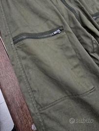 Tuta intera di colore verde oliva con chiusura a zip centrale a due vie.