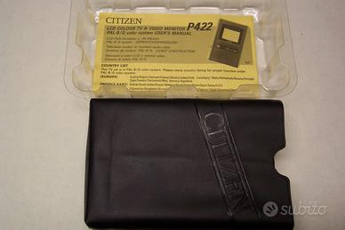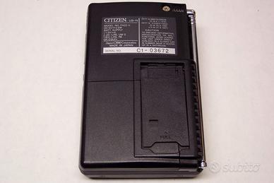 Uno dei primi TV portatili con schermo LCD, prodotto dalla Citizen. In confezione originale, completo di custodia ed istruzioni. Funzionante ma NON PIU’ IN GRADO DI RICEVERE AUTONOMAMENTE, dall’introduzione del digitale terrestre Raro pezzo di archeologia elettronica. Buono stato eccetto supporto per inclinazione danneggiato. Consegna gratuita a Padova