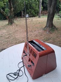 In vendita raro televisore Voxson dal design iconico degli anni '70, modello portatile con doppia antenna telescopica integrata. Perfetto esempio di estetica Space Age, con scocca in plastica lucida color ruggine e forme bombate tipiche dell’epoca.