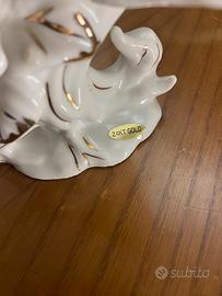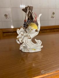 Statuina in porcellana raffigurante un uccello, realizzata dalla manifattura Karl Ens di Volkstedt, caratterizzata dall'uso di vere piume applicate sulla figura in porcellana e dettagli in oro 24K.