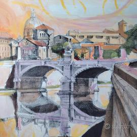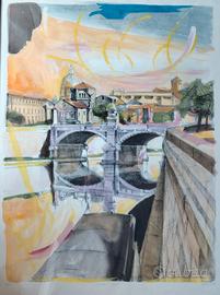 Meravigliosa litografia ritoccata a mano di cm. 86x65,raffigurante l'isola Tiberina. L'opera è posta in una cornice di radica di noce.