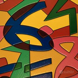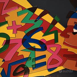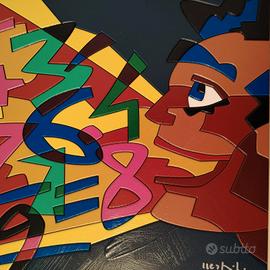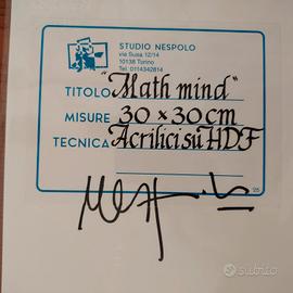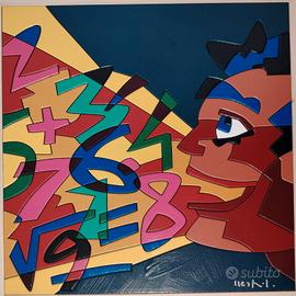 Bellissima opera del Grande Maestro Ugo Nespolo(ora in Mostra a Palazzo Reale-Milano). realizzata in acrilico su supporto in HDF, la composizione si sviluppa entro un formato quadrato (30 x 30 cm) che accoglie una scena dinamica e stratificata. In primo piano emerge un profilo umano stilizzato, costruito attraverso campiture nette e giustapposizioni di colori saturi – rossi, blu e aranci – che si intrecciano in una sintesi grafica essenziale ma fortemente espressiva. Il volto, delineato con tratti decisi e quasi fumettistici, appare assorto in una dimensione mentale, evocata dal flusso caotico e vibrante di numeri e segni matematici che occupano lo spazio circostante. Questa proliferazione di cifre, disposte in un apparente disordine controllato, richiama esplicitamente il tema della “mente matematica”, suggerendo un universo cognitivo in cui il linguaggio numerico diviene forma visiva, ritmo e colore. La superficie, trattata con precisione tecnica e brillantezza cromatica, riflette la tipica predilezione di Nespolo per materiali industriali e finiture levigate, in dialogo con le esperienze del design e della comunicazione visiva. L’opera si colloca nel solco della poesia visiva e delle ricerche della Neoavanguardia, dove parola, segno e immagine si fondono in un unico sistema espressivo. In tal senso, la citazione «Ogni parola, in quanto tale, è una generalizzazione» trova qui una trasposizione visiva: i numeri, simboli universali e astratti, diventano materia pittorica e insieme riflessione sul linguaggio e sulla conoscenza. Firmata in basso a destra, l’opera si presenta in ottimo stato conservativo ed è incorniciata in una sobria cornice lignea che ne valorizza la brillantezza e l’equilibrio compositivo. Condizioni perfette! P.S. Io ritengo che comprare Nespolo sia un ottimo investimento! Un Artista storicizzato vivente conosciuto in tutto il mondo.