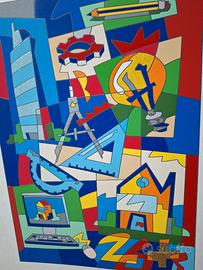 opera grafica del maestro Ugo Nespolo, serigrafia materica a 40 passaggi di colore con interventi in glitter foglia oro e argento ,carborundum e passaggio calcografico a secco opera firmata e numerata dall'artista fa parte della cartella delle 4 professioni di nespolo. titolo: constructor ad arte misura: 35x50 autentica: catalogo di pubblicazione arte focus arte Pentagono editore autorizzato prezzo trattabile!