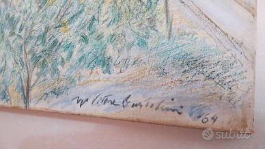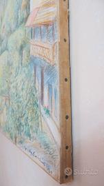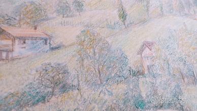 Bellissimo paesaggio dipinto con pastelli colorati su tela
