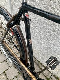 La Imperiale del 1941 aveva il perno della ruota posteriore sfilabile, una chicca tecnica molto sofisticata e soprattutto utile, che permetteva di poter sfilare la camera d'aria senza dover smontare tutta la ruota. Le ruote da 28" hanno i mozzi originali marcati Dei e i cerchi in acciaio sono dritti ed in ottime condizioni, da cui deriva che la frenata è assolutamente perfetta e molto potente. La bicicletta è stata completamente smontata ed ogni più piccolo pezzo è stato pulito, lucidato ed ingrassato ad arte prima di passare al rimontaggio finale. Tutte le sfere del movimento centrale, sterzo, ruote e pedali sono state sostituite e ora la bicicletta gira incredibilmente scorrevole e silenziosa, tanto da sembrare senza peso. Pedali originali Dei marcati. Manopole in corno a bariletto restaurate e bellissime. Gruppo luci Aprilia bellissimo e funzionante, con il caratteristico paraspruzzi sulla dinamo. Bronzino Omega dell'epoca. La bicicletta ha il parafango posteriore mai stato bucato per montare fanalini o gemma, ed usciva così dalla fabbrica Umberto Dei. Questa Dei del 1941 fu prodotta durante la guerra ancora nel primo stabilimento di Via Paoli a Milano.