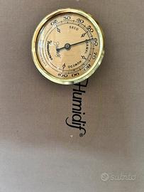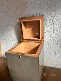 Vendo elegante humidor vintage della Humidif in ottime condizioni estetiche e funzionali. Design classico da scrivania/viaggio: interno in legno di cedro (tipico degli humidors), cerniere e fermagli in ottone dorato. Linee pulite, look retrò-chic — perfetto come regalo, per collezionisti o per tenere in casa una piccola selezione di sigari.