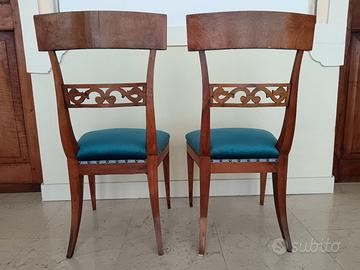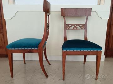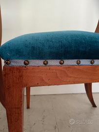Le poltroncine, realizzate con lo schienale arcuato impellicciato in noce fiammato e un decoro traforato a mezza schiena, sono state fatte imbottire da professionista da pochi anni. Il magnifico velluto di seta color lapislazzuli, con passamaneria italiana e borchiette metalliche (originali), le rende un arredo raffinato e protagonista di un interno.