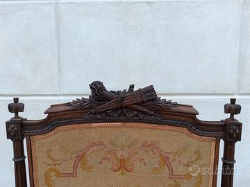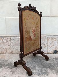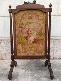 Regale parafuoco o parascintille in legno intagliato a motivi rococò e pannello ricamato con scena galante. L’oggetto, completamente integro, presenta minime mancanze dovute al tempo, come in foto.