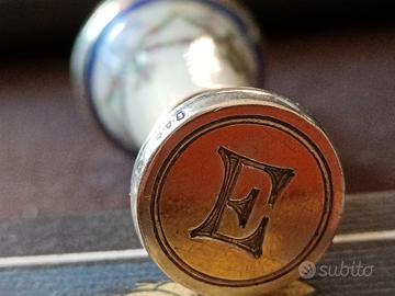 Un aristocratico sigillo da cera lacca in porcellana, argento e pietra dura, recante la lettera "E". Il fusto, dipinto a mano con finitura in oro, è un prodotto magnifico del gusto della prima metà del XIX secolo. Realizzato nel XIX a Vienna (il punzone presente indicherebbe una manifattura viennese", è un oggetto di grande raffinatezza per collezionisti, conservato con grande cura. Presenti due punzoni nell'argento. H.7,5 cm Provenienza: famiglia principesca nell’Austro-Ungheria