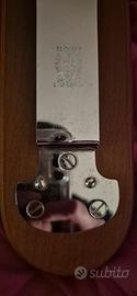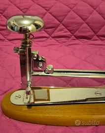 Si tratta di una cucitrice (o pinzatrice/spillatrice) da tavolo in metallo cromato con base in legno.