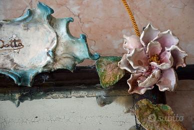 Una splendida specchiera liberty (ultimi 20 anni del 1800) in ceramica dipinta, della manifattura Nove- Bassano, con applicazione di fiori colorati.