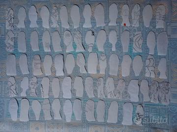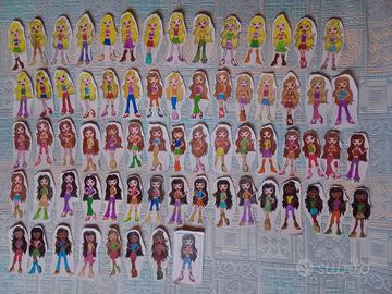 Sessantanove mini modellini di Bratz , alte 11 cm , nei loro outfit più fashion , creati usando il giochino "Gira la Moda Bratz" e colorati con le matite colorate + altri 12 mini modellini Bratz, pinzati in verticale a motivo di album