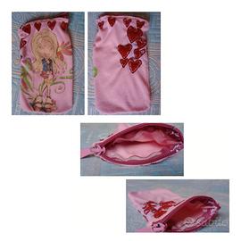 Sacchetto Bratz in tessuto rosa, realizzato artigianalmente in fibra di poliestere e cotone, con cordino in raso, la cui lunghezza è 20 cm e la larghezza è 11,3 cm