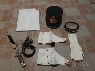 Uniforme storica della Scuola Sottufficiali dell'Esercito Italiano comprensiva di giacca taglia 50, pantalone taglia 48, camicia (un altra camicia ancora nella confezione originale mai usata), mantella invernale taglia M, chepì, spadino con cordino porta spadino, guanti bianchi, soprascarpe bianche, calzature nere taglia 41