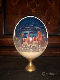 Coppia di uova di struzzo decorate a mano, che presentano un paesaggio miniaturizzato all’interno. Appoggiati su un supporto dorato.
