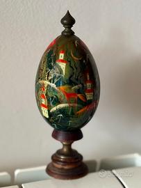 Uovo decorativo artigianale iconografia russa in legno laccato, dipinto interamente a mano co tre firme, con raffigurazione iconografica di Cristo Pantocratore e scena simbolica sul retro. L’oggetto presenta più firme in alfabeto cirillico: “Матрешка” (laboratorio collettivo artigianale), “Иоанн”(Giovanni), “Марк” (Marco), “Лука” (Luca), riconducibili a diversi artisti del laboratorio o probabilmente agli evangelisti, come tipico della tradizione artigianale russa. Base composta da metallo con anello in legno. Oggetto autentico di arte decorativa russa, non industriale, fine XX secolo. Altezza totale circa 14 cm. Buone condizioni generali.Prezzo leggermente trattabile. Ritiro a mano: Monza - Milano e Prov.(fermata metro) - Bergamo