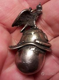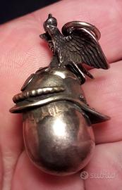 pendente in argento punzonato. uovo sormontato da elmo con aquila imperiale . periodo zarista , fine ottocento, primi novecento.