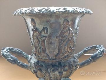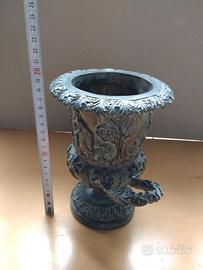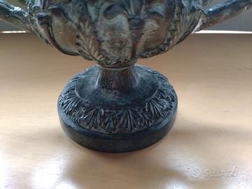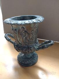 Urna decorativa vintage in bronzo della metà del XX secolo con motivo greco in rilievo. Splendide le raffigurazioni anche delle palme ed altre piante. Ottime condizioni, senza rotture ne crepe. È perfetta per riporre piccoli oggetti o come elemento decorativo su una mensola o su un tavolo. Misure di riferimento in foto. Le foto descrivono esattamente l'urna e sono parte integrante della descrizione. Visita il mio profilo per altri vasi in bronzo e non solo.