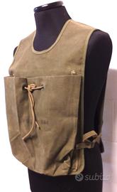N4) US Army Ammunition Carrier Vest M-2, modello colore olive drab originale WW2 poco usato in condizioni molto buone. 100% originale, completo di cinghiaggi. Tipico gilet porta munizioni M2 dell' US Army della 2GM in O.D. (olive drab). Poco usato in condizioni davvero molto buone, realizzato in materiale canvas di tela pesante. Non ci sono marchi o date del produttore. La borsa per munizioni M2 della 2GM aveva due grandi tasche progettate per trasportare proiettili di mortaio da 60 mm. Sia per squadre di mortaio che per squadre di bazooka.