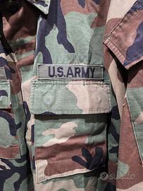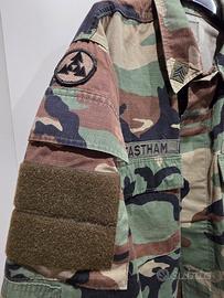 Modello Bdu in colorazione woodland con nome dell'operatore, gradi e reparto d'appartenenza,modificata in taglio Raid per i reparti speciali.