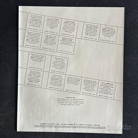 Offro un foglio commemorativo degli Stati Uniti della serie “Celebrate the Century”, dedicato agli anni 1900, emesso nel 1998 dal Servizio Postale USA (USPS). Include 15 francobolli non annullati da 32 centesimi ciascuno, ognuno raffigurante eventi iconici come il primo volo dei Wright Brothers, Honus Wagner, Teddy Bear, e John Muir.