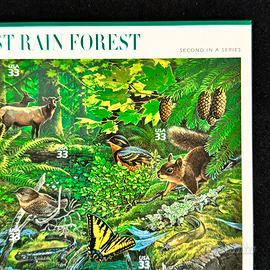 Offro un foglio commemorativo degli Stati Uniti dedicato alla “Pacific Coast Rain Forest”, emesso nel 1999 dal Servizio Postale USA (USPS) come secondo di una serie. Include 20 francobolli non annullati da 33 centesimi ciascuno, raffiguranti la fauna e la flora della foresta pluviale della costa pacifica (es. cervi, salmoni, farfalle, anatre).