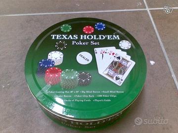 Scatola per giocare al Texas Poker (Nuova) ottima come regalo di Natale, completa di3 panno verde, istruzioni di gioco, fish, e fish del Big Blind, Small Blind, Dealer e Carte da gioco.
