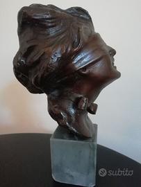 Scultura in bronzo su piedistallo quadrato in marmo grigio, raffigurante l'allegoria della fortuna. Firma dell'autore V. Aurisicchio (Napoli 1855 - 1926) incisa sul retro. Altezza cm. 20