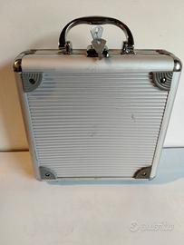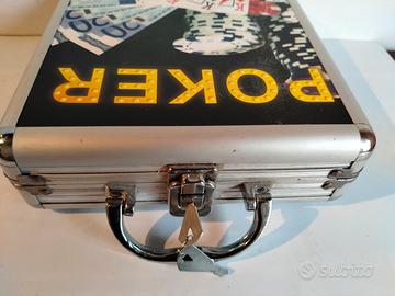 Elegante valigetta da poker con un design accattivante. - Include fiches da poker blu e bianche. - Carte da gioco e dadi. - con chiave.