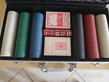 Set da poker con valigetta in metallo pari al nuovo. Mai giocata, aperta una volta solo per controllo. Presenti ancora parti plastificate (manico valigia, dadi, 2 colonne di fiches e 1 mazzo di carte), presente anche involucro di cartone. Fiches da gioco da 0,50 - 1 - 2 - 5 - 10.