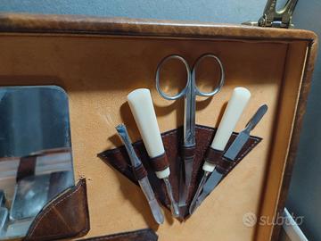 Con: specchio, forbici, lima, pinzetta, spazzola, porta spazzolino, porta sapone, porta profumo e altri gadget per manicure.